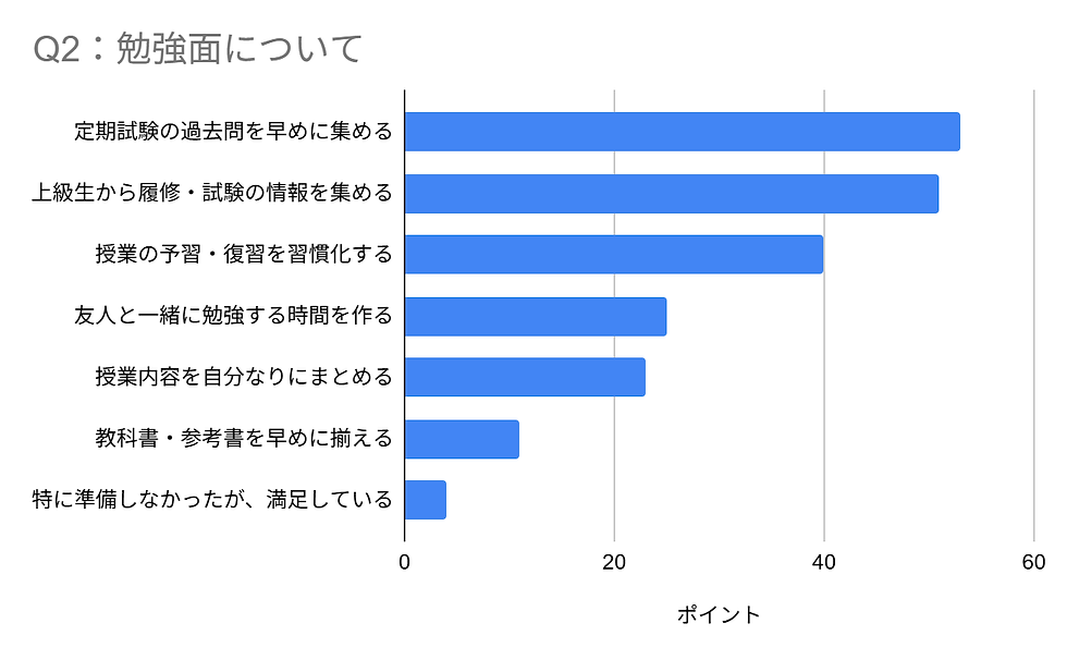 多くの票が集まったのは「定期試験の過去問を早めに集める(53p)」「上級生から履修・試験の情報を集める(51p)」でした。やはり事前の情報収集が鍵となるようです。
